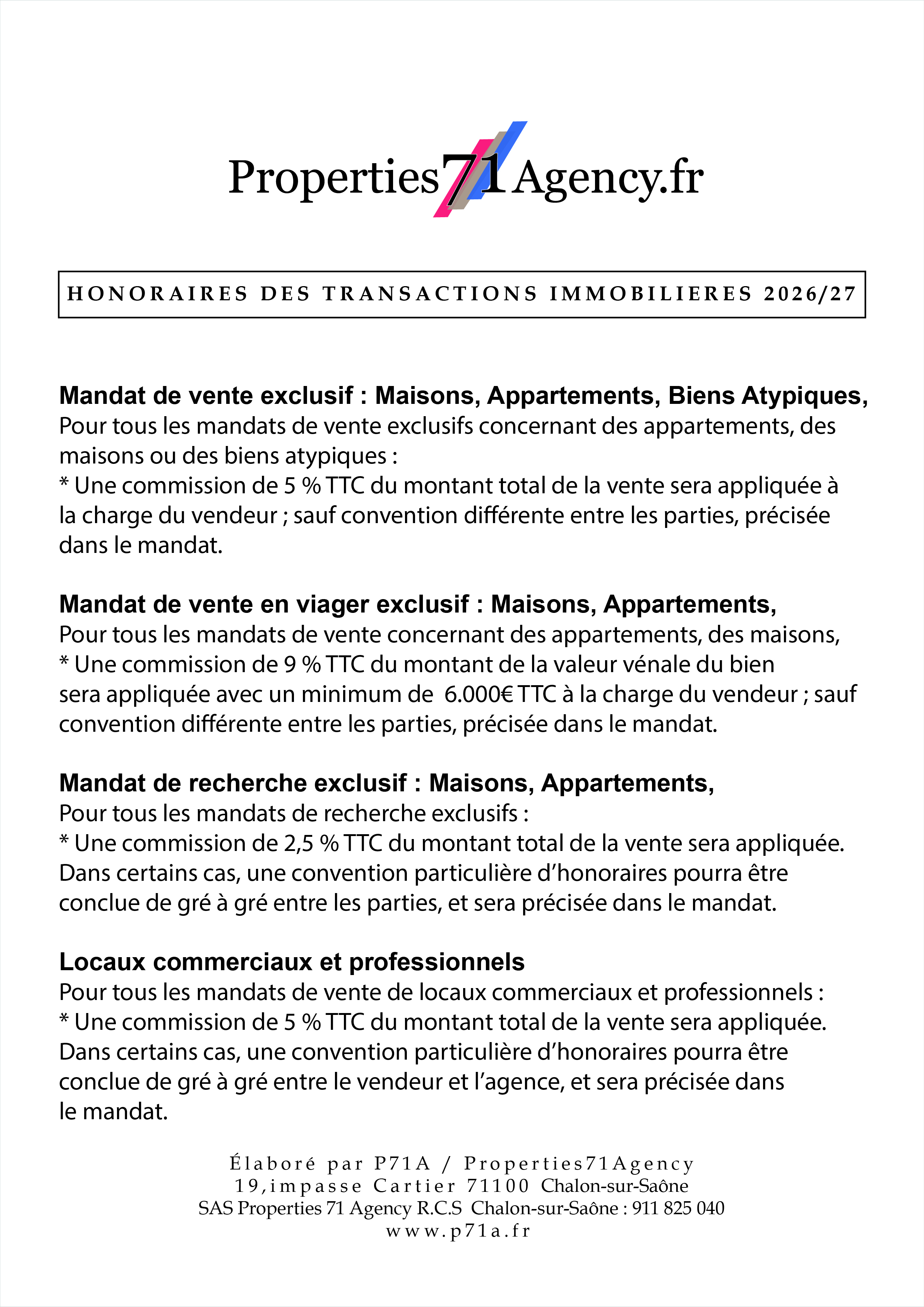 Chez Properties 71 Agency, nous croyons en une approche claire et honnête de la tarification. Découvrez nos honoraires compétitifs pour des services immobiliers de premier ordre, pensés pour vous accompagner au mieux dans vos projets à Chalon-sur-Saône et ses environs. Avec 30 années d'expérience et plus de 1000 biens vendus, notre expertise est à votre service pour vous guider vers le succès.
